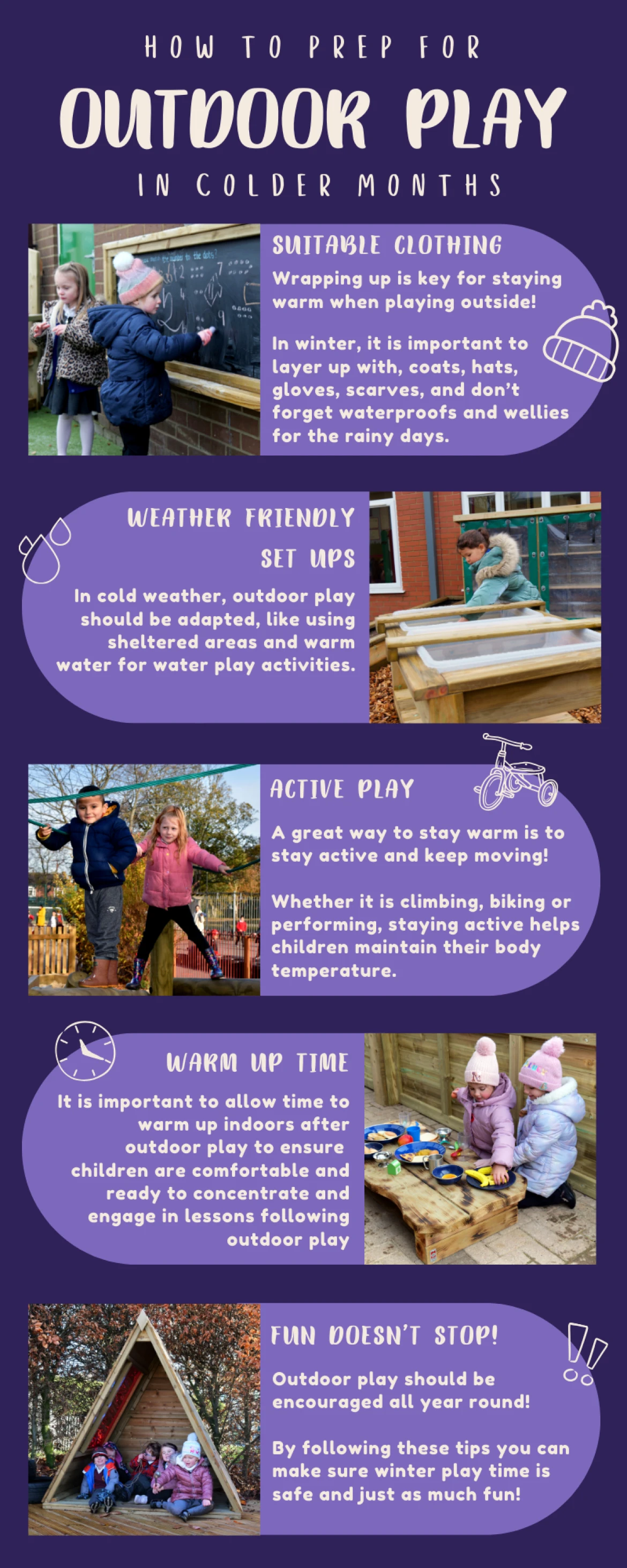 As well as physical benefits, winter outdoor play leads children to learn to face new challenges, build resilience, and interact with others through creative exploration and group activities. With the right resources and preparation, outdoor spaces become vibrant environments for imagination, collaboration, and discovery even on colder days.