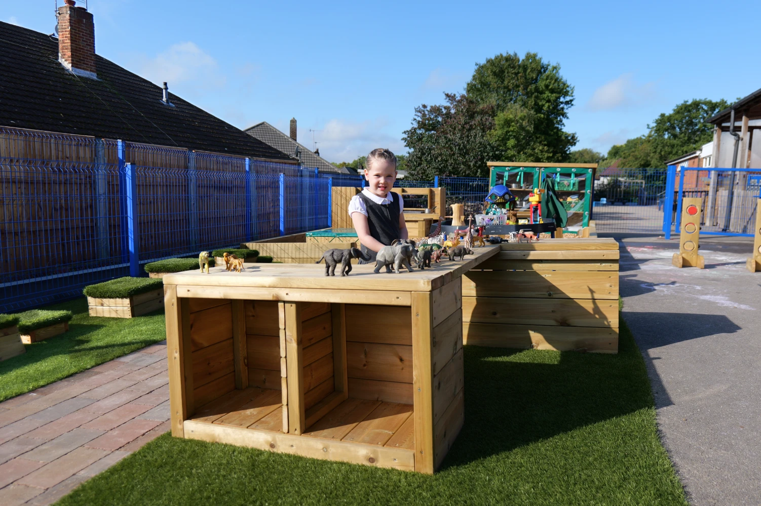 Newby Leisure's Outdoor, Wooden, Movable Storage Table provides endless play and storage possibilities for your school or nursery playground.