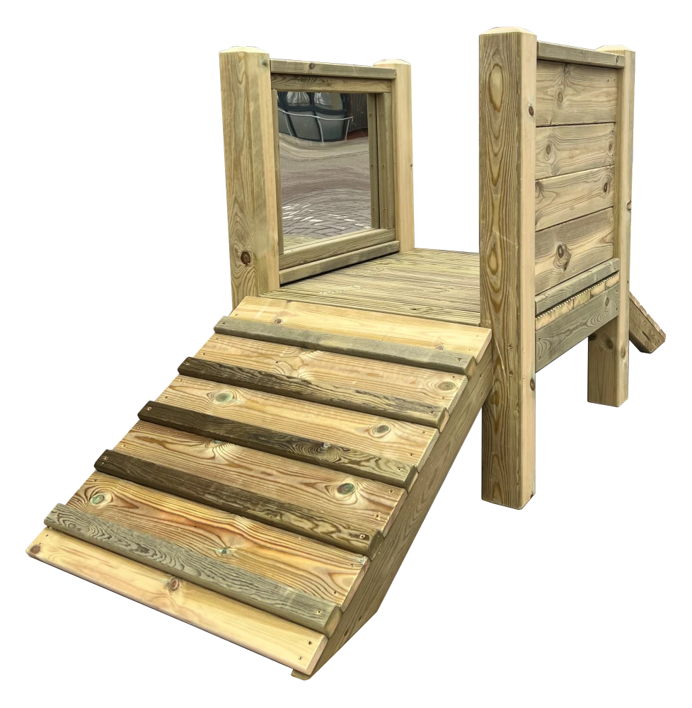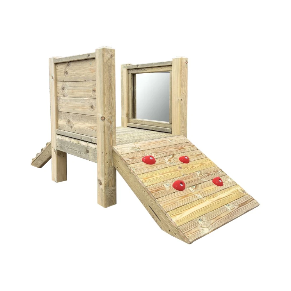 A small scale climbing unit with a mirror and chalkboard for added engagement.